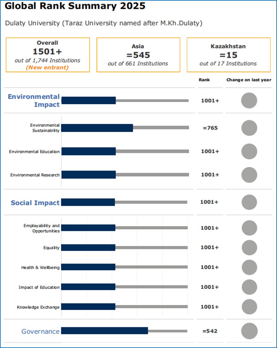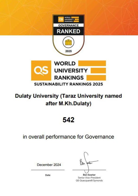 Біз Дулати университеті (М.Х. Дулати атындағы Тараз университеті) QS 2025 орнықты даму рейтингінде дебют жасап, қазақстандық жоғары оқу орындары арасында көптеген негізгі индикаторлар мен көрсеткіштер бойынша көшбасшылықты көрсеткенін мақтанышпен хабарлаймыз.