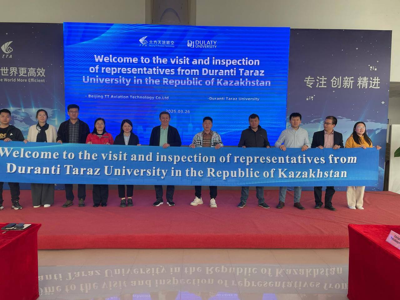 В результате поездки между китайской компанией «Changshu Mingyi Nonwoven Machinery Co., LTD» и Таразским университетом имени М.Х. Дулати в городе Шанхай был заключен меморандум о научно-техническом и образовательном сотрудничестве в области реализации совместных программ научных исследований и технических разработок в сфере производства нетканых материалов различного ассортимента, а также планирования компоновки цехов и оборудования. С компанией заключен меморандум о сотрудничестве в следующих областях: